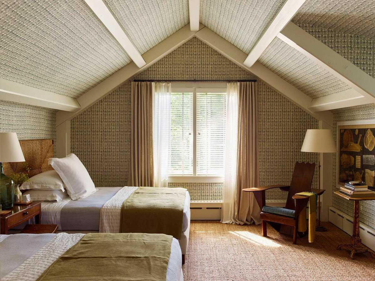 Если спальня уже есть, то из мансардного помещения можно сделать дополнительную гостевую комнату. Отличие лишь в размещении кроватей – их ставят под скатами вдоль всей крыши.