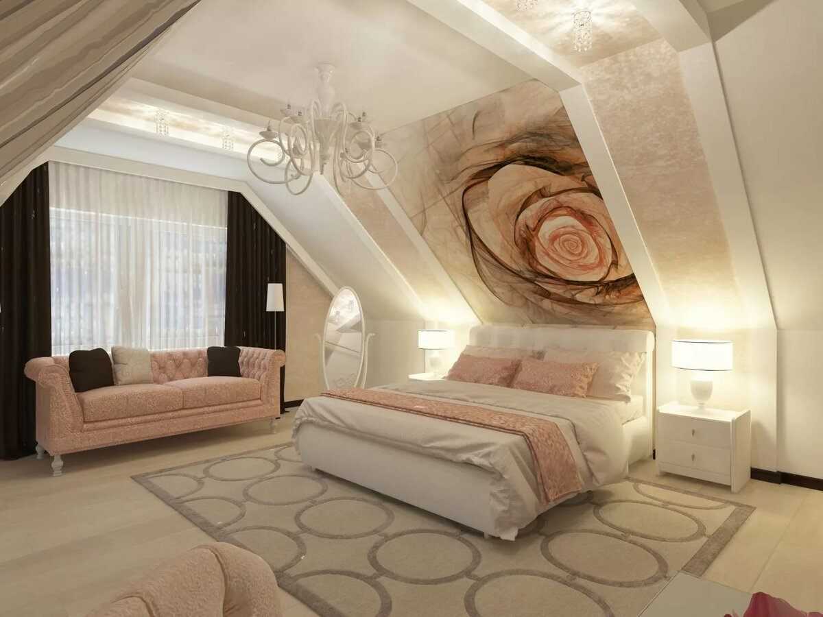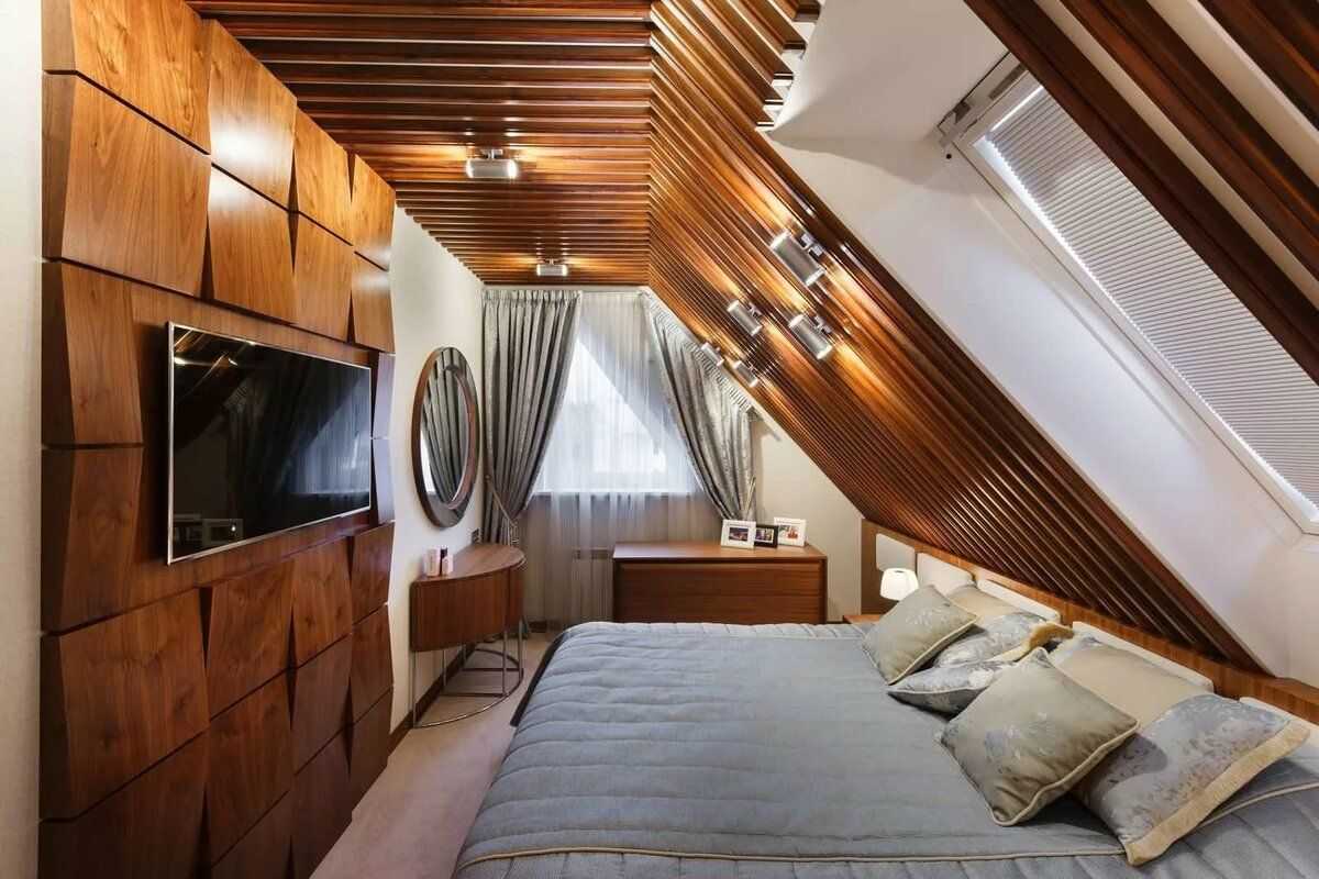 - Крыша сложной формы или ломаной конфигурации усложняет задачу. Опытные дизайнеры рекомендую каждую часть обособленного пространства наполнять соответственно разному функционалу или по принципу зонирования, как на фото.