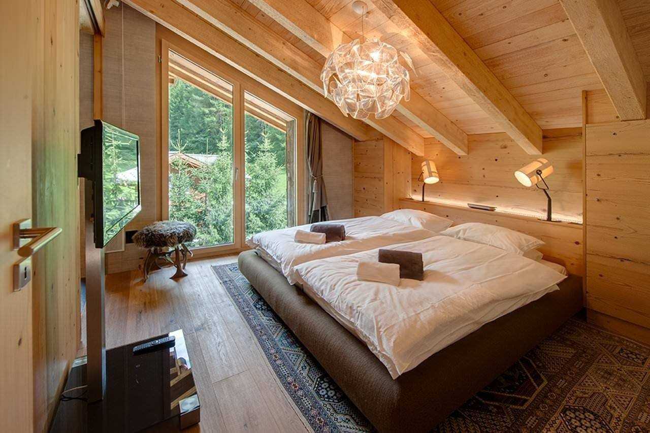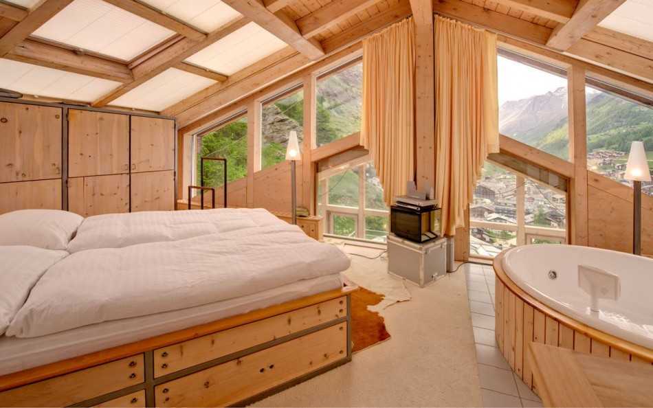 При упоминании стиля шале в воображении сразу появляется просторное помещение с балками на потолке, большими окнами, теплыми коврами и обилием деревянной мебели простых форм. Этот стиль отлично вписывается в убранство загородного дома. В спальне, как правило, только самая необходимая мебель, а вместо ковра можно использовать интересную деталь – шкуру животного.