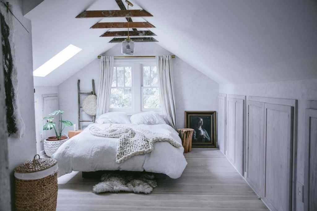 - Шторы и другой текстиль. Особенно важным является выбор занавесей, которые могут быть выполнены, как из прозрачного материала, пропускающего свет, так и из более плотной ткани, способствующей затенению комнаты. Довольно распространенным решением для спальни, считаются жалюзи или шторы день-ночь, которые не пропускают дневной свет. Для чердачного помещения в светлом исполнении, будет уместен яркий декор, в виде подушек, покрывала, пледов или небольшого коврика, расположенного посередине комнаты или возле спального ложа.