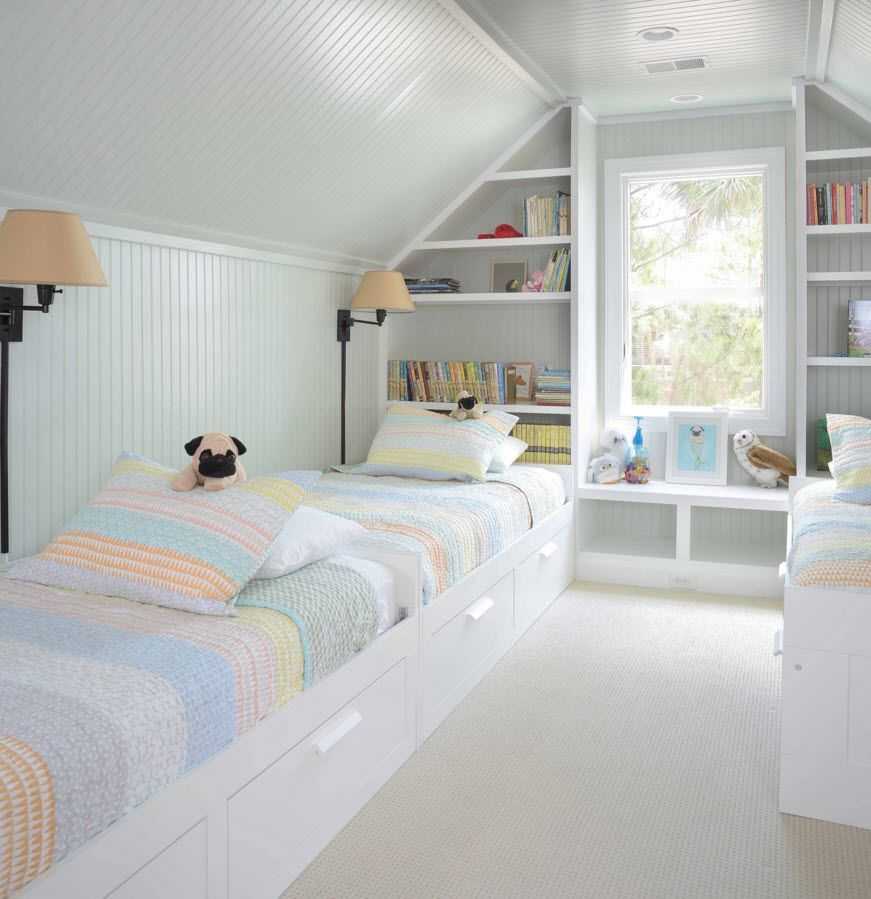 Чердачное помещение с двускатной крышей, особенно подойдет для оборудования спальни для двоих детей. Благодаря подобной планировке получается сформировать отдельный участок для каждого ребенка.
