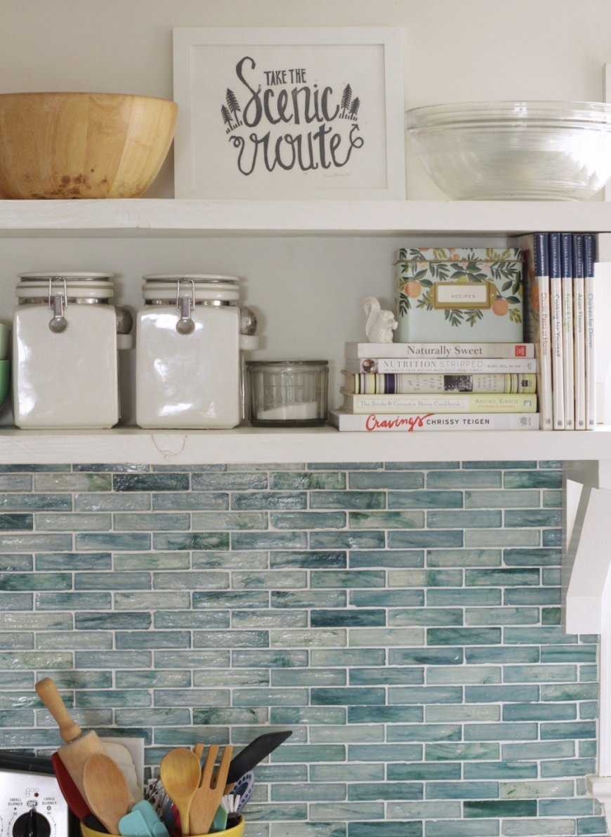 Интересно будет заполнить стеллажи декоративными баночками или с соленьями. Это придаст уюта помещению. Заполнить прозрачную банку можно разноцветными макаронами разной формы. Это не только стильно, но и стимуляция аппетита. Также на них можно разместить кулинарные книги.