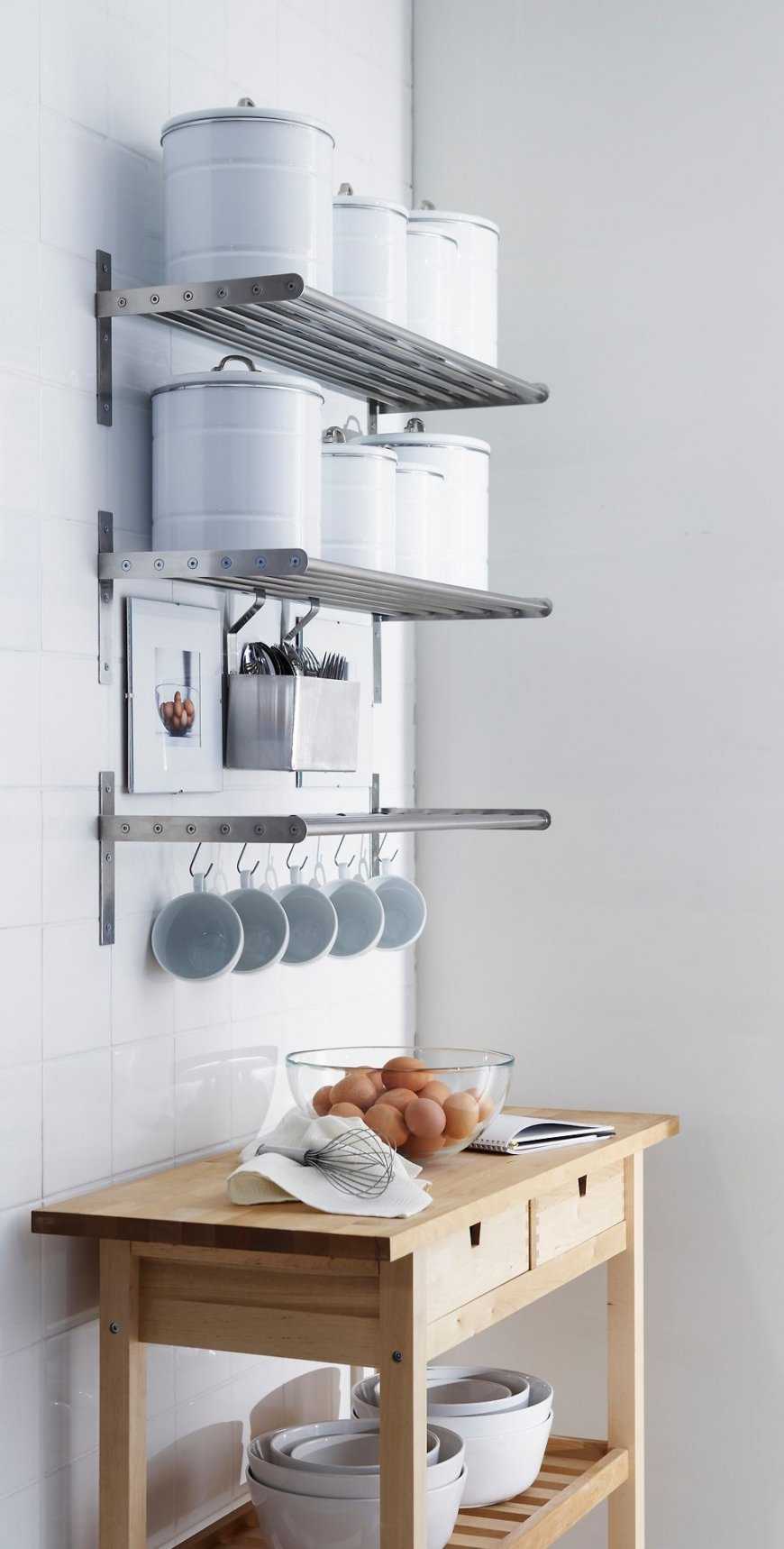 Деревянные, пластиковые, металлические стеллажи позволят эргономично организовать пространство на кухне