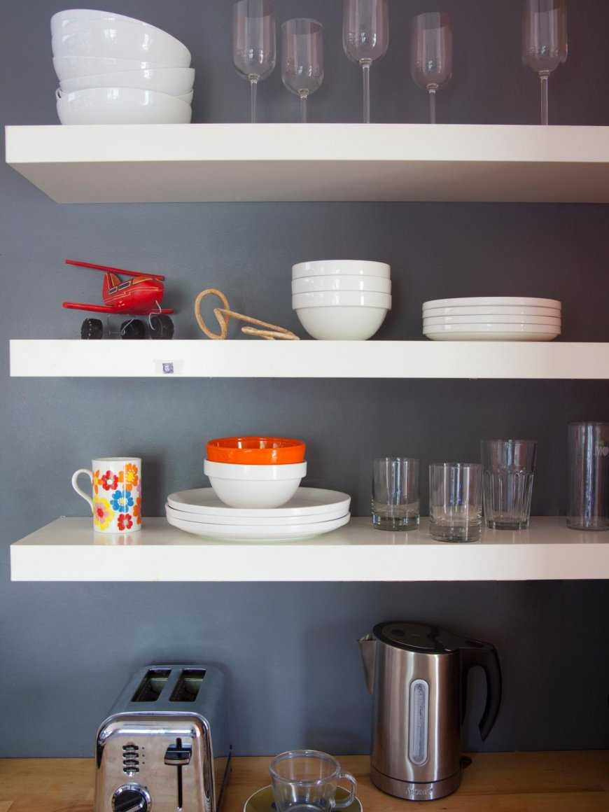 - Полочки с декоративными элементами следует установить на другой части кухни, чтобы предметы не загрязнялись при готовке.