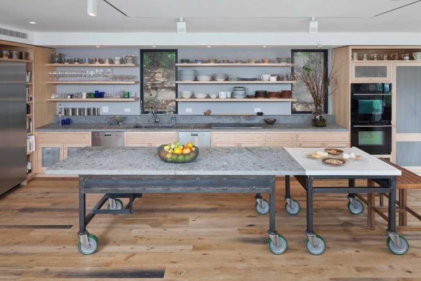 Открытые полки на кухне представляют собой максимальную практичность. Стеллажи можно смело использовать в разных стилях. Они впишутся как в классическую кухню, так и в современную
