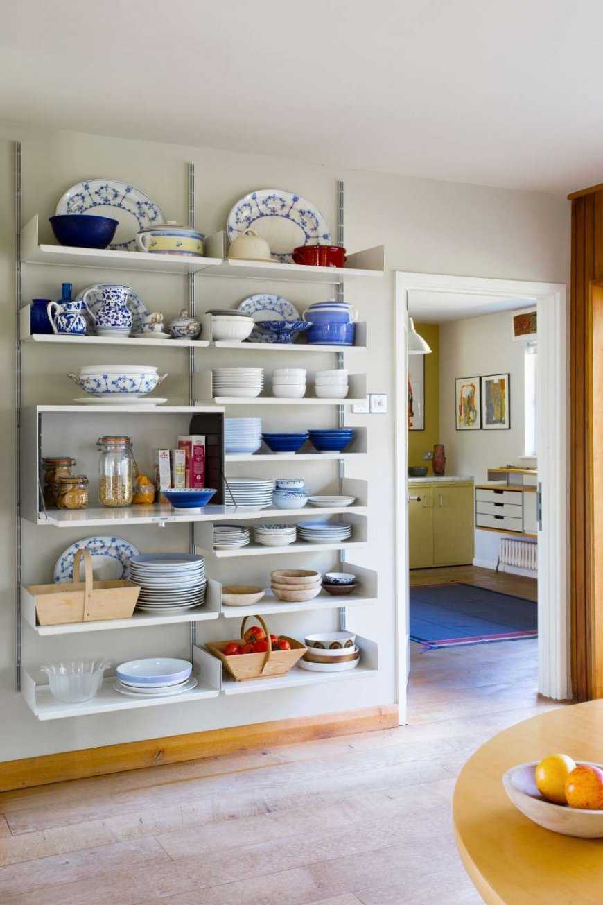 При желании стеллажи можно комбинировать с закрытыми шкафчиками. Посуда первой необходимость всегда будет под рукой, другую можно спрятать. Так уйдет эффект загромождения. А небольшие полочки оживят интерьер.